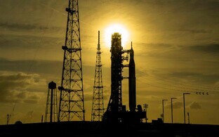 8. Päikesevarjutuse ajal jäädvustatud fotol langeb päikesevalgus Kuule otse tagant. Foto tegi üks Orioni kosmoselaeva päikesepaneelidele kinnitatud kaameratest ja esiplaani vasakus servas joonistub välja laev ise. Kuu vasak serv tundub ülejäänud kettast pisut heledam – seda tänu koduplaneedilt tagasi peegelduvale valgusele ehk Maa helgile. Kuu alumisest paremast servast veidi allpool särav hele punkt on planeet Saturn ning sellest edasi, pildi parempoolsesse serva jääv täpp on Marss.