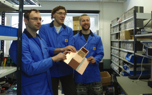 ESTCube-2 pardaarvuti meeskond. Vasakult paremale: Ervin Oro, Indrek Sünter, Mathias Plans, Jan Aare van Gent, Maxime Robin ja Annika Jaakson.